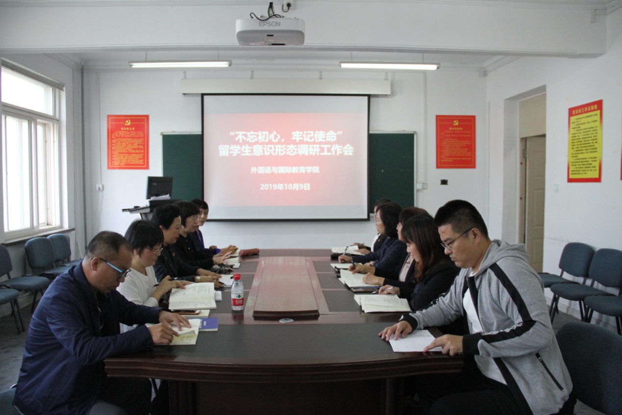 10月9日,麻豆视频 党总支在学院党员活动室召开“不忘初心、牢记使命”主题教育来华留学生意识形态工作调研座谈会。学院班子成员、对外汉语教研室教师、留学生管理人员、组织员参加会议,会议由党总支书记邓艺主持。