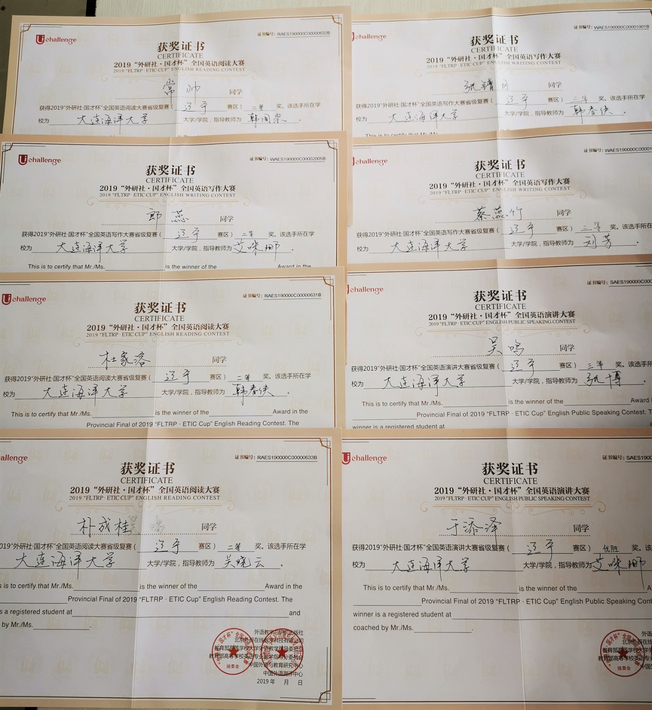 10月26日至27日,“2019年辽宁省普通高等学校本科大学英语挑战赛暨2019“外研社国才杯” 全国大学英语演讲、写作、阅读大赛(辽宁省赛区复赛)”在辽宁大学蒲河校区举行,我校选派的8名参赛学生喜获佳绩,为我校赢得了荣誉。其中有4名学生分别获得写作大赛、阅读大赛二等奖,有3名学生分别获得写作大赛、演讲比赛三等奖,有1名学生获得演讲比赛优胜奖。