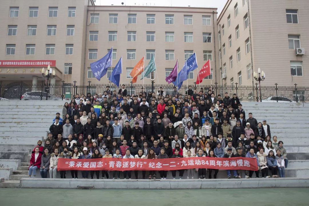 活动仪式在校田径运动场举行。首先主持人介绍了“一二九”的历史背景,并号召广大青年应不忘初心、牢记使命;铭记历史、开创未来。随后青年志愿者协会会长隋洪彬为本次活动致辞,他指出,八十四年前,北平学生的爱国行动,得到了全国学生的回应和全国人民的支持,形成了全国人民抗日民主运动的新高潮,推动了抗日民族统一战线的建立。八十四年后的今天,我们以滨海慢跑的形式来纪念前辈们“抛头颅洒热血”的壮举,以此来缅怀过去,追念先人,更是为了让我们牢记国耻。“前事不忘,后事之师”,让这段历史转化为我们强大的力量,在新时代追寻“中国梦”。慢跑活动结束后,同学们有序在展板上签下自己的名字,以此表达对“一二九”运动的纪念之情。