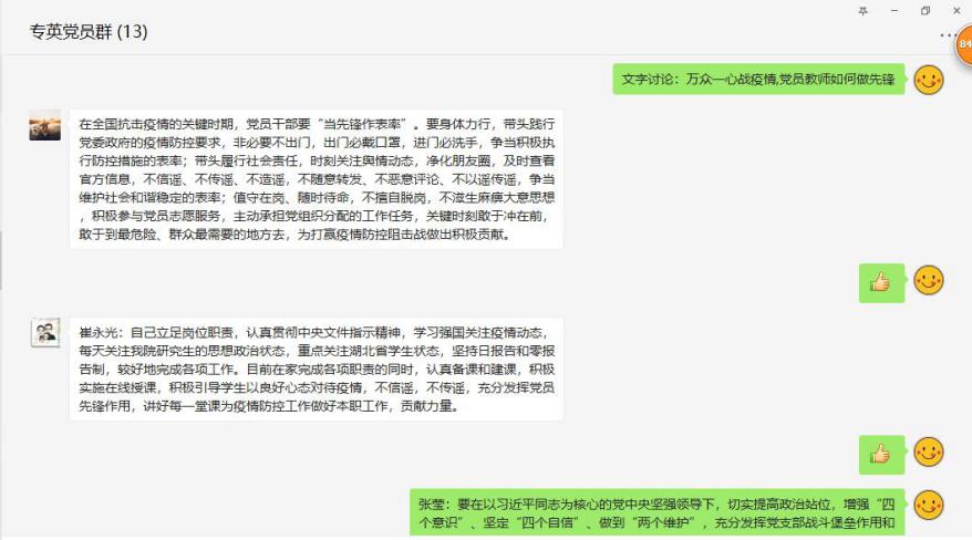 疫情发生以来,教工支部党员积极宣传、科学防控,在落实教师健康情况监测工作的同时,定期在学院微信公众号推送双语版“总书记说”;撰写咨政建议2篇;积极响应教育部“停课不停教”的号召,全身心投入到线上教学准备工作;建立课程学习群,引导学生相信党和政府的决策,相信科学,不信谣不传谣,切实做好自己和家人的防护工作;指导学生利用优质在线教育资源加强自主学习、探究式学习,使学生在做好疫情防控的同时,也能够加强学习,不断提高完善自己。