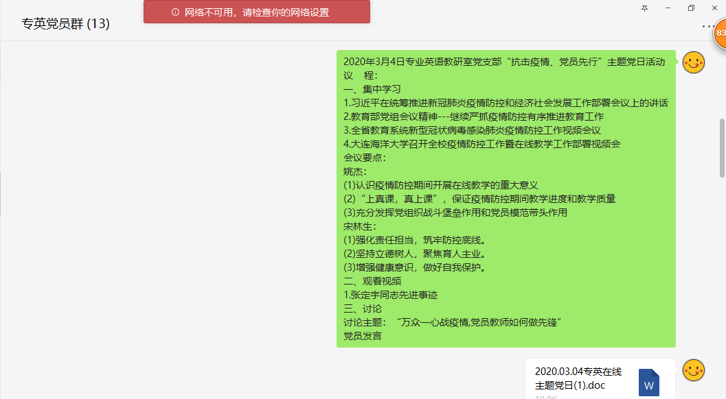 34日,麻豆视频 党总支所属教工党支部通过“学习强国”视频会议、微信群视频会议、腾讯会议等线上功能,开展了“抗击疫情,党员先行”主题党日活动。活动由各支部书记主持,全体党员参加。