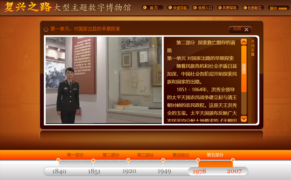 展览全景式回顾了1840年鸦片战争以来,中国各阶层人民在屈辱苦难中奋起抗争,为实现民族复兴进行的种种探索,特别是中国共产党领导全国各族人民争取民族独立人民解放、国家富强人民幸福的光辉历程,充分说明历史和人民怎样选择了马克思主义、怎样选择了中国共产党、怎样选择了社会主义道路,使中华民族以崭新姿态屹立于世界东方。展览由《中国沦为半殖民地半封建社会》、《探求救亡图存的道路》、《中国共产党肩负起民族独立人民解放历史重任》、《建设社会主义新中国》、《走中国特色社会主义道路》五大部分组成,包括图片748张、珍贵文物630件,配乐解说95分钟,电视政论片6集共270分钟,史料翔实、气势恢弘、语言深沉,观者无不欢欣鼓舞、精神振奋。