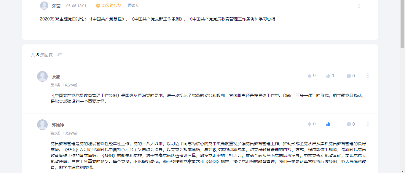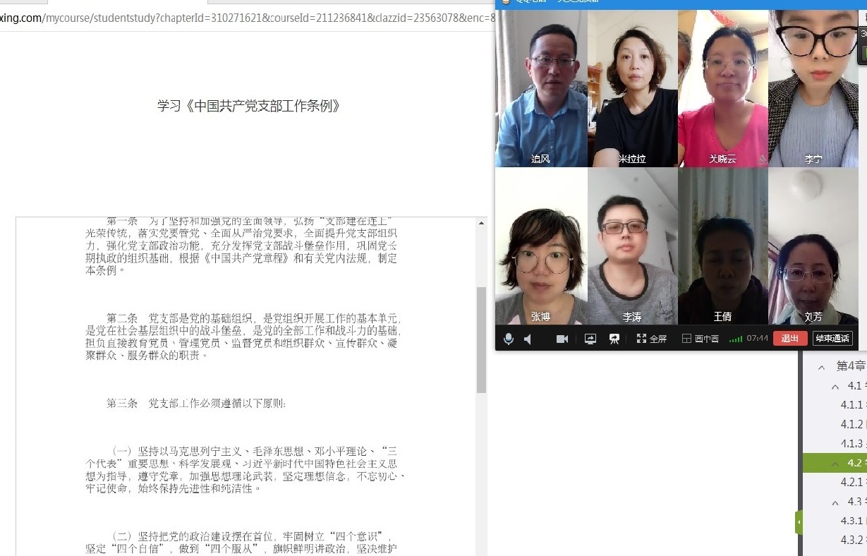 5月6日下午,麻豆视频 党总支各教工党支部通过超星泛雅网络教学平台、“学习强国”视频、微信视频、腾讯会议等形式开展主题党日活动,组织全体党员集体学习党内工作条例。