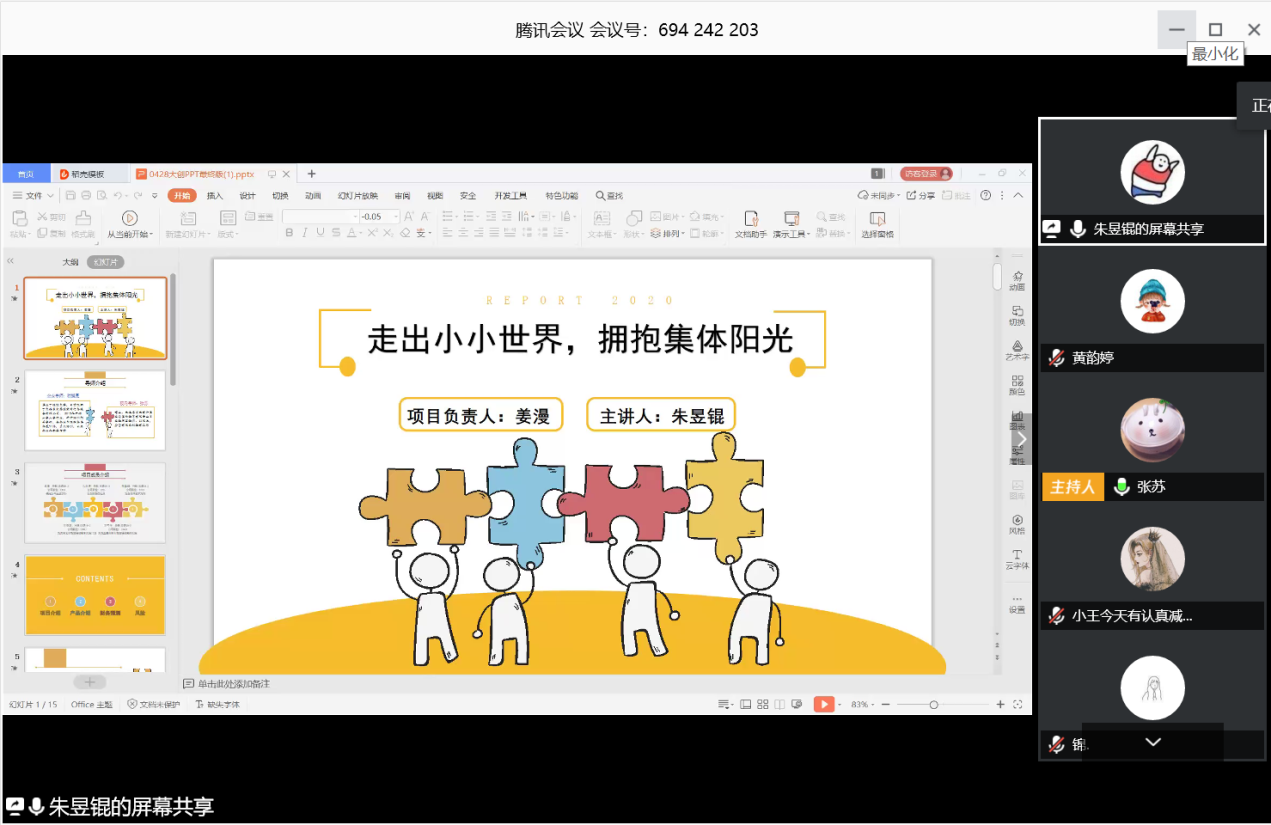 经过评审委员的综合评分,姜漫等同学的《走出小小世界 拥抱集体阳光》(指导教师:张苏)被确定推荐国家级项目申报;傅梦圆等同学的《“爱心携手,与你同行”主题网络公益支教活动》(指导教师:林雅琴)被确定推荐省级项目申报,另有7个项目推荐申报校级项目。
