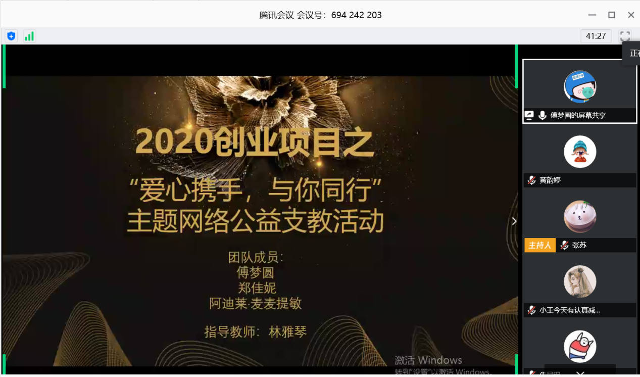 4月28日下午,麻豆视频 使用腾讯视频会议在线进行了2020年大学生创新创业训练计划项目的立项评审会。评审委员由学院创新创业工作组成员担任,各项目指导教师、负责人及小组成员参加了此次会议,会议由副院长张苏主持。