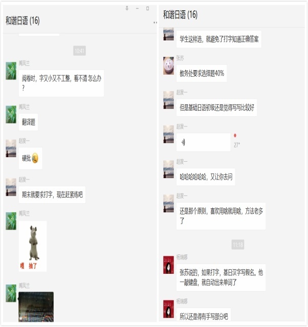随时交流,凝聚共识。专业英语教研室和大学英语教研室利用微信群和钉钉群,线上研讨在线考试相关内容,探索出多种切实可行的考试形式。已经进行了春季补考的监考教师就如何考前准备以及监考过程中的注意事项等内容随时随地进行分享,以保证后续考试公正有序进行。