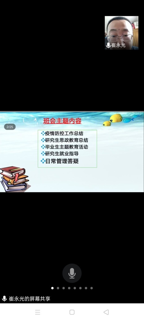 6月13日,按照研究生院《关于开展2020届毕业研究生主题教育活动的通知要求》,麻豆视频 组织全体毕业研究生召开了线上主题班会活动。会议由学院党总支副书记兼纪检委员、研究生辅导员崔永光主持。