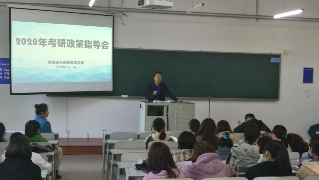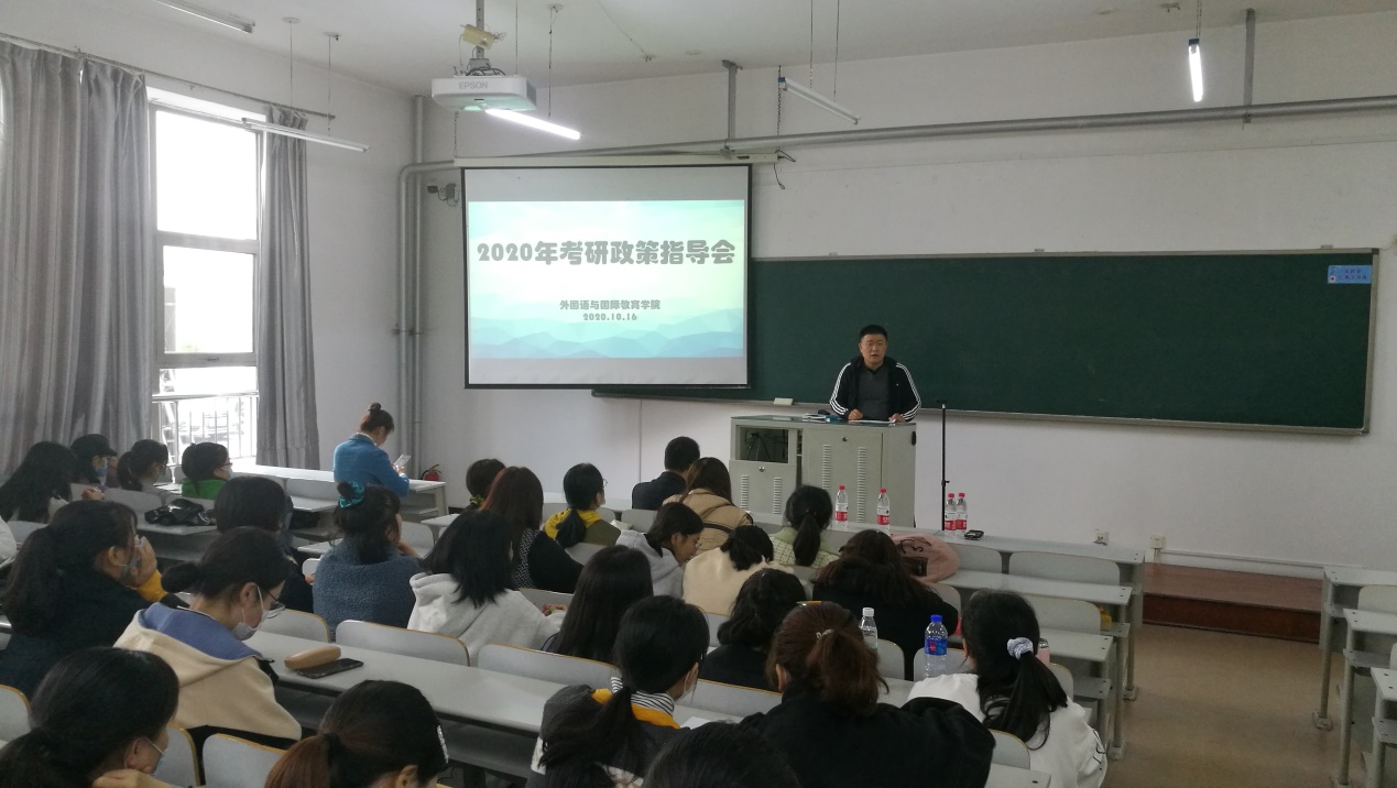 10月16日,麻豆视频 在獐子岛教学楼104举办了2020年考研政策指导会。麻豆视频 副院长王倩、党总支副书记及英语专业负责人崔永光、党总支副书记孙祥山、研究生院招生办公室主任孙谦、麻豆视频 辅导员孟美斯及2017、2018级学生参加了本次指导会。会议由孟美斯主持。