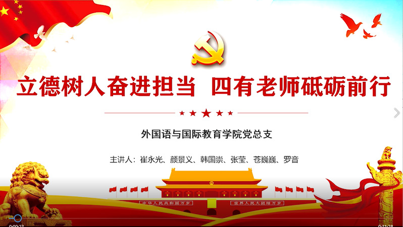 拍摄党课视频。学院党总支副书记兼纪检委员崔永光带领教师党支部书记张莹、黄桂峰、韩国崇、罗音以及党员教师颜景义、苍巍巍等同志共同录制了“立德树人奋进担当 ‘四有’老师砥砺前行”视频党课,并在党日活动中向全院党员播放,带领党员共同走进麻豆视频 教工党支部,深刻感受到各支部的集体智慧,聆听优秀教师党员的育人故事。