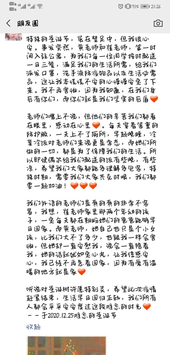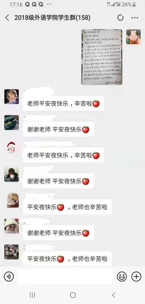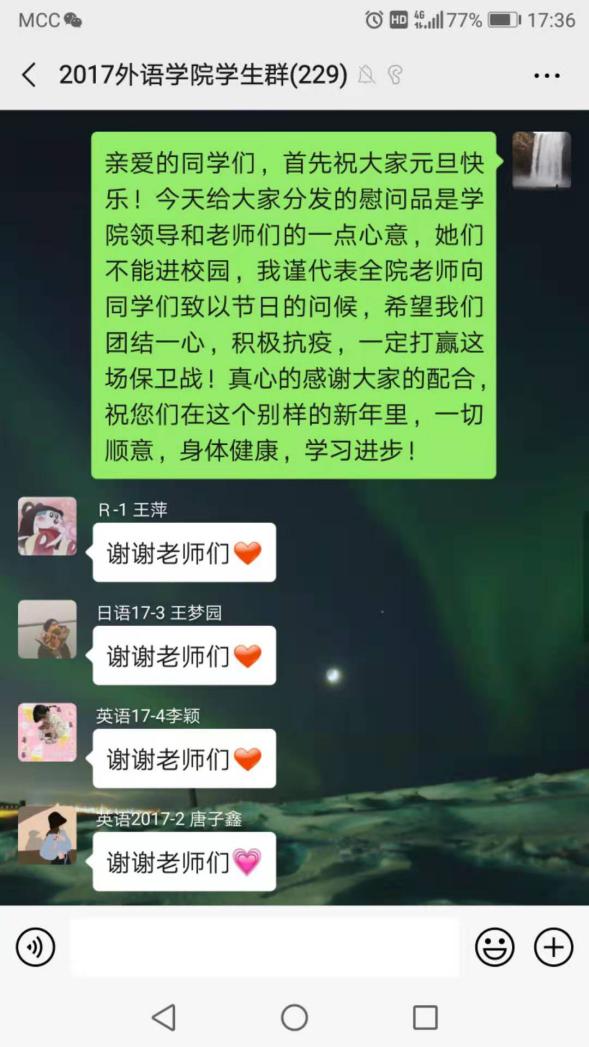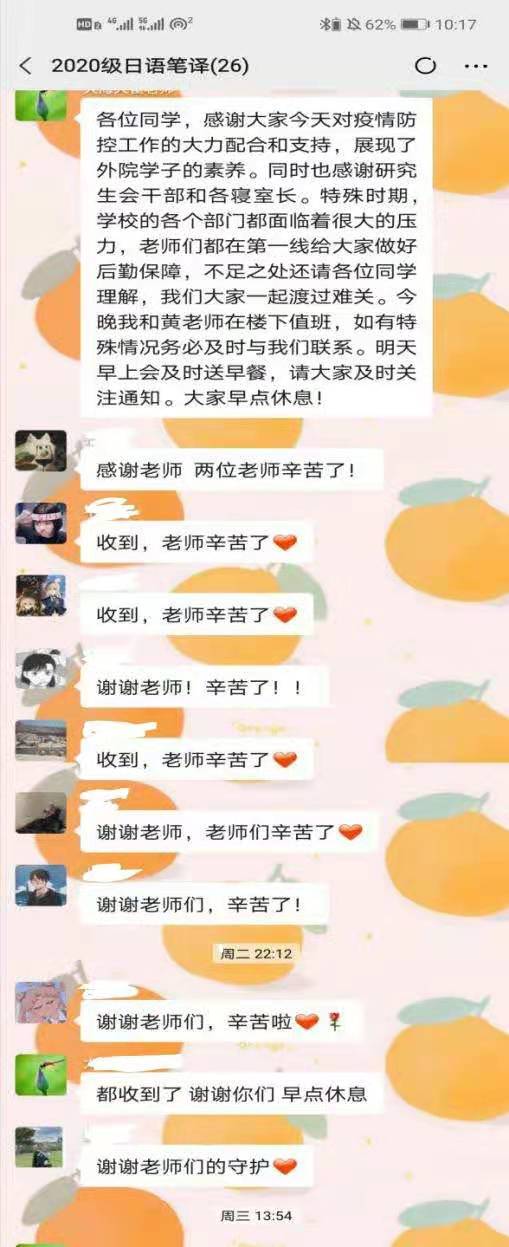 疫情无情人有情。老师们用大爱为同学们撑起了一道道坚实的“防疫墙”。他们的悉心关怀使同学们安心、家长们放心,凝聚起广大学子抗疫必胜的坚定信念。有同学写道:“落日弥漫的橘,天边透亮的星。老师啊,您就像那天边的星星,点亮了我们前方安全的路。”“再多的溢美之词都不足以表达我们对您们的感激之情!”“无痕的师德,犹如竹杖芒鞋,风雨中坚定不移。”“我们不怕,那些迎着疫情逆行的老师们用自己的行动给出的真心、正义、无畏和同情,终将战胜这一场没有硝烟的战疫!”