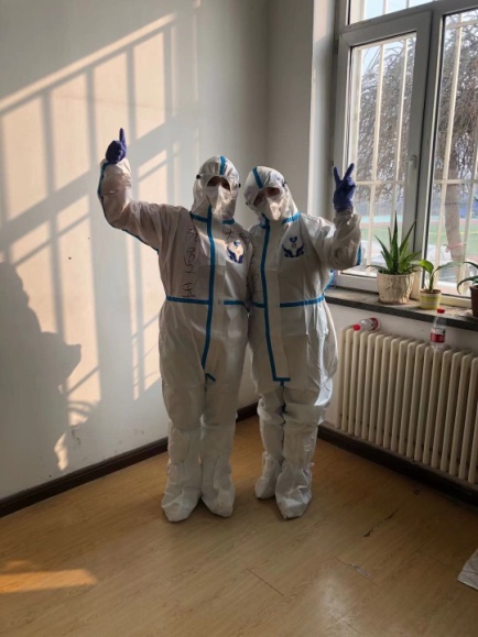 学院党总支副书记孙祥山老师(右)、本科生辅导员李宇晨老师(左)在黄海校区校内公寓开展抗疫工作