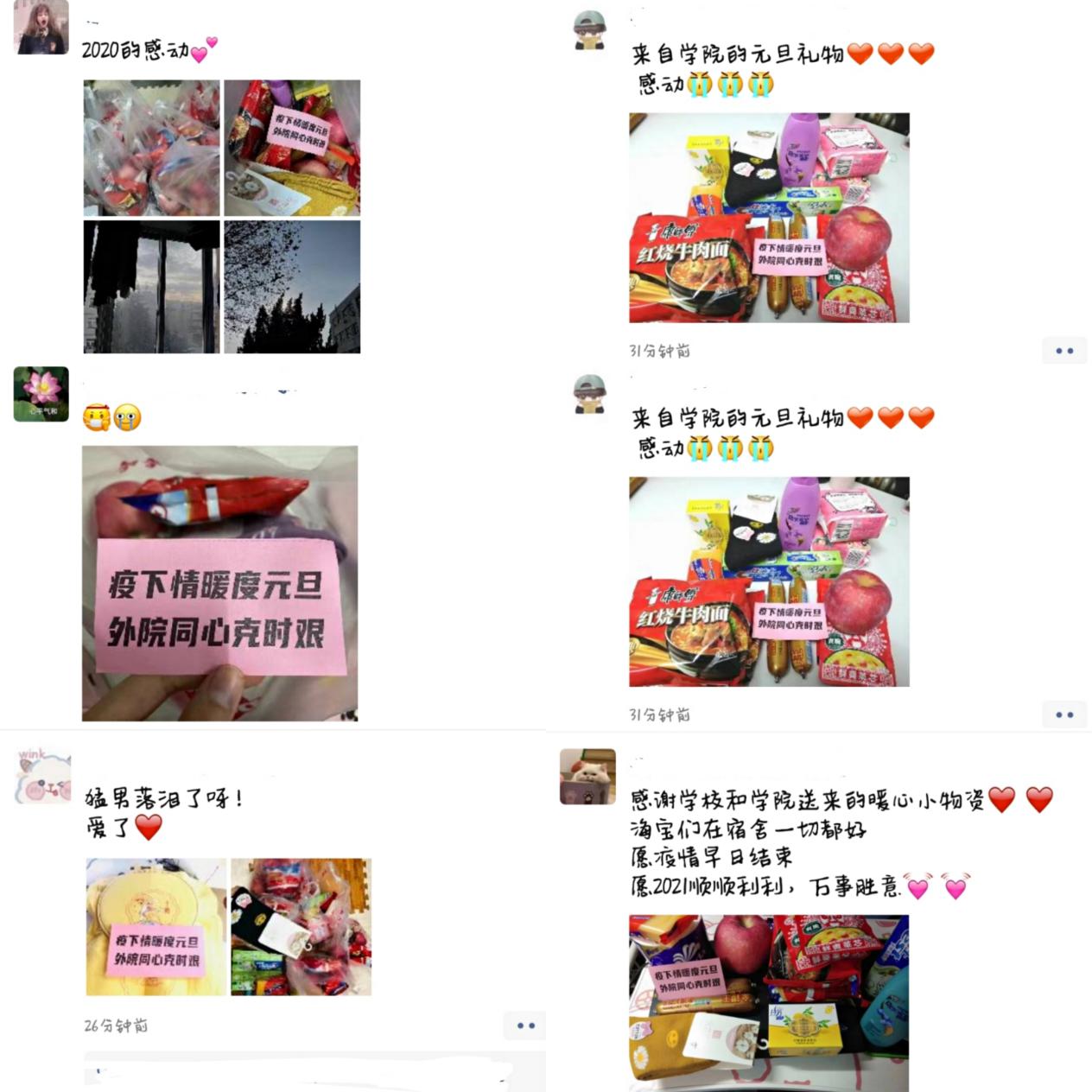 “疫下情暖度元旦,外院同心克时艰”。学院多方协调,筹备食品及生活物资分发给学生,让同学们过上一个温暖的元旦