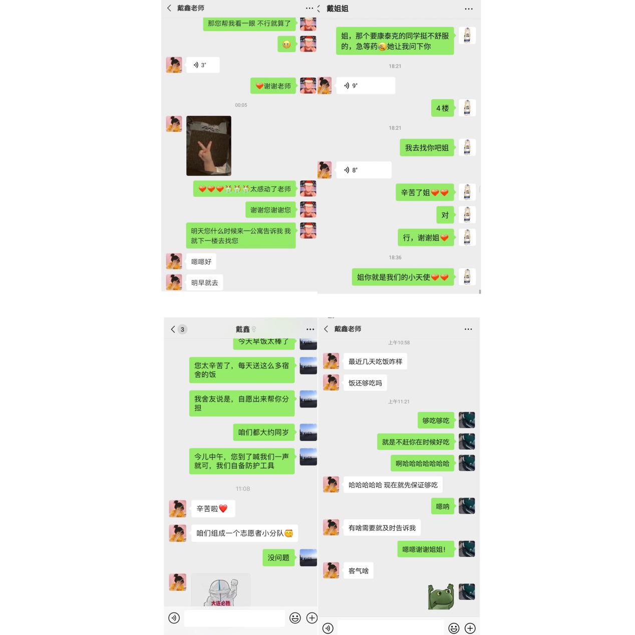 在得知有同学不舒服的时候,她着急又心疼,立即帮助学生们购买药物送去,反复叮嘱学生要谨遵医嘱,定时吃饭吃药。1月初,大连风雪不停。公寓外面的坡路被冰雪覆盖,寸步难行,一次,她刚出楼门就滑倒摔躺在地上,但她还是忍着疼痛站起来继续为同学们送药,一直到晚上回到寝室才简单处理了一下腿上的伤。即使每天忙到很晚,自己很多时候都在吃冷的饭菜,她也会抽出时间询问同学们饭菜是否够吃,生活必需品是否够用。她主动倾听学生诉求,把学校的关怀传递给同学们。12月25日,她专门走访大四学生宿舍,为考研学生加油打气,带去美好祝愿。在考试当天,她亲自接送考研学生,保证学生们安心完成考试,安全往返于考场与宿舍之间。元旦在即,她带着志愿者们一起将学院送来的物资进行分装发放,反复核查是否有遗漏。她说,“每一个同学肯定都很期待元旦的礼物,我不想让她们失望”。1月6日,她组织学生召开了线上会议,再次向同学们强调了防疫期间的纪律,及时回应学生近期普遍关心的开学返校时间、车票退订、实习实践等问题。“虽然有些通知和注意事项已经给同学们说过了,但还是感觉不踏实,得给他们开个电话会议强调一下” “召开学生电话会议,听到每个人熟悉的声音,听到他们亲口报一声‘我很好’,心理感觉踏实多了”。她的悉心关怀获得了同学们的一致好评,被学生亲切的称为“戴姐姐”。她说“你们放心,我会是你们坚强的后盾。疫情不停歇,我一刻也不会松懈”。