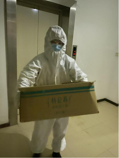 在学生公寓,戴鑫每天穿上防护服,戴上消毒手套,竭尽全力守护同学们的健康。乍一看她乖乖巧巧的,但小小的身体里仿佛蕴含着巨大能量。她建立了各专业、各宿舍疫情防控工作群;多次召开寝室长会,积极做好相关信息的上传下达,增强与同学们协同作战的合力;有序组织同学们完成物资分发工作;提醒同学们勤洗手,做好宿舍卫生工作。纵使汗水浸透了防护服,她仍然毫无怨言的奔波在为学生服务的第一线。那些承载物资的箱子很重,即使是一个男生抱起来都有些费力,但她从未退缩,每次都与其他男老师一起搬运物资。网络谣言伴随疫情而来。她在完成繁重的日常工作的同时,及时推送官方信息,引导学生树立正确的疫情防控意识,带头做防控知识的传播者、疫情谣言的制止者、健康校园的守护者。她关心同学们的生活和心理状况,坚持每天走访宿舍,提醒同学关注各地防疫政策,和大家拉家常,分享自己大学时期有趣的事情来缓解大家焦虑的心情。“大家可以利用这段时间好好学习”“咱们再坚持坚持,疫情很快就会过去”“只要大家有需要,随时联系我。”