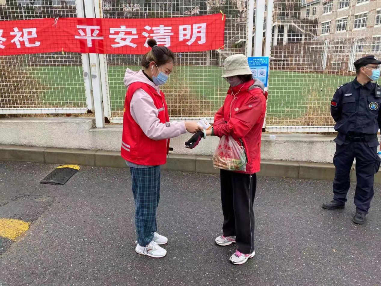 学生志愿者在黑石礁街道红星社区工作人员的带领下,在西尖山路与行政执法人员一同为往来人员测量体温、检查行程码并严格控制火种入林,同时向市民宣传文明祭扫注意事项。