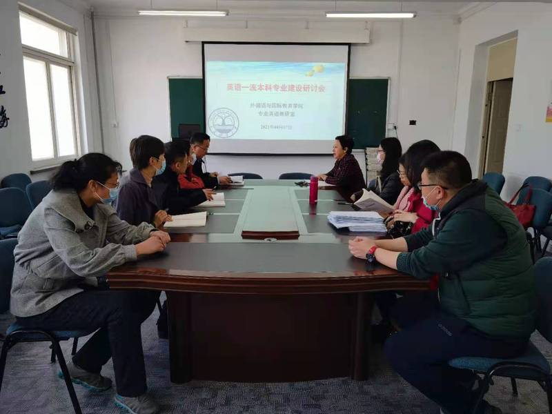 专业英语教研室全体教师在会议室召开英语一流本科专业建设研讨会。会议由郭艳玲院长主持。