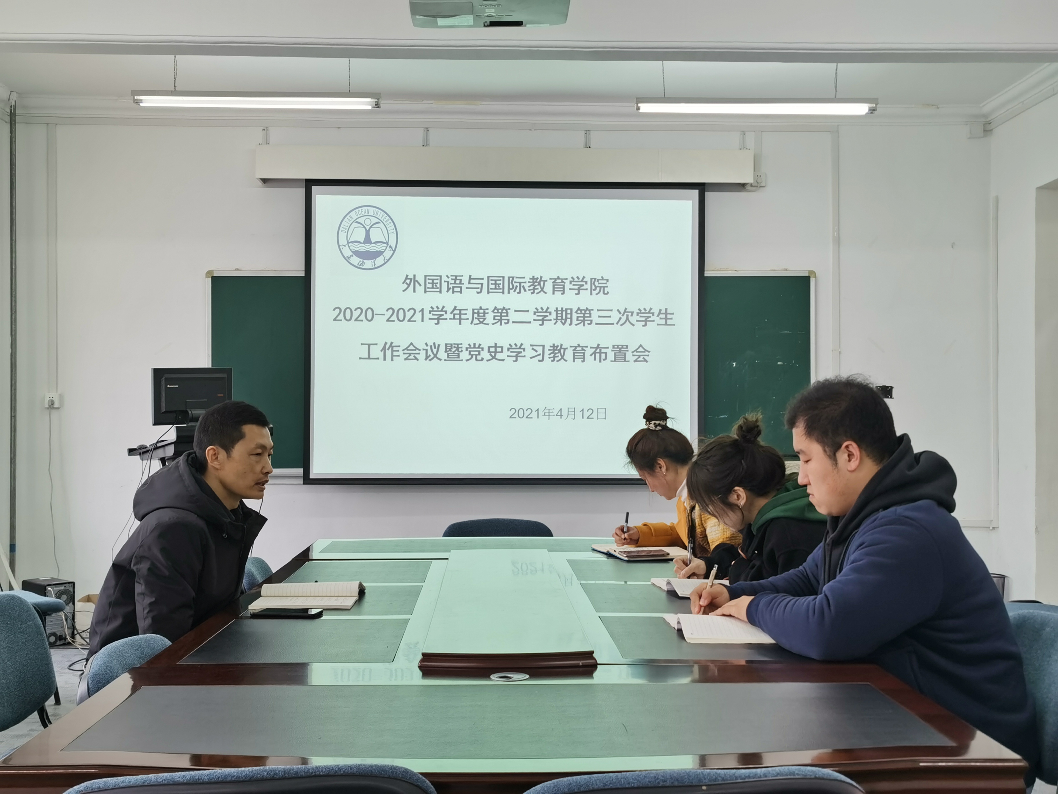 4月12日下午,麻豆视频 在学院206会议室召开2020-2021学年度第二学期第三次学生工作会暨党史教育布置会。学院全体辅导员参加会议,学院党总支副书记孙祥山主持会议
