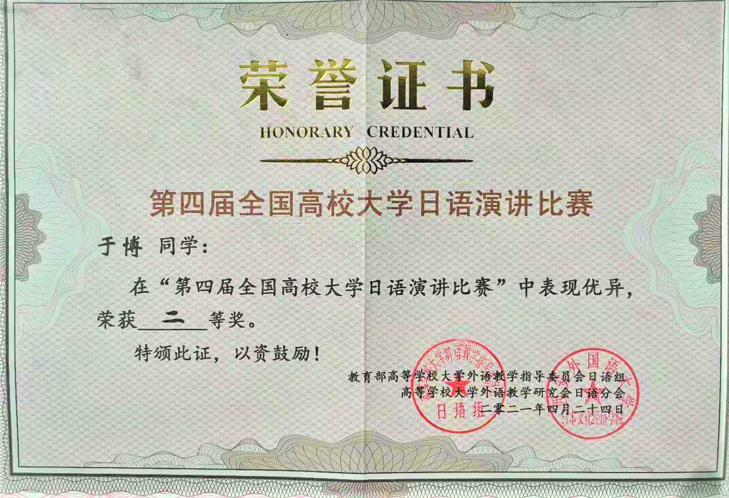 本次比赛有来自大连外国语大学、西安外国语大学等57所高校的57位选手参加。经过初赛选拔,共有35位选手入围决赛。比赛采用“线上+线下”双线融合的比赛模式,分为命题演讲和即兴演讲两部分。命题演讲根据选手提交的演讲视频进行打分;即兴演讲采取线上“即问即答”的形式进行,加大了比赛难度。我校海洋科技与环境学院2017级于博同学以鲜明的主题、流利的语言表达、沉着冷静的现场表现,赢得了评委的一致认可,获得“第四届全国高校大学日语演讲比赛”二等奖。