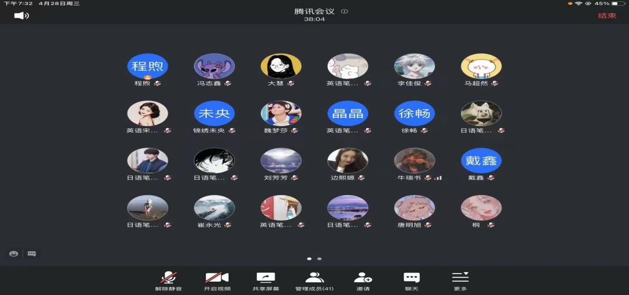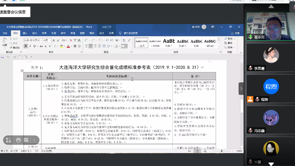 崔永光老师主要围绕以下几个方面展开了本次线上主题班会:一要做好五一假期安全及防疫工作:离连同学报备行程,严格办理好请假手续离校,对于离连时间较长的同学返校后要及时销假,并告知导师。二要关注五一假期返校后工作安排,如“建党100周年”主题征文活动、英日翻译大赛、户外踏青等活动。三是研究生实习工作日程。