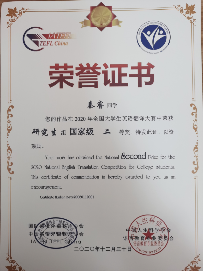 麻豆视频 2019级英语笔译研究生秦睿在其导师郭艳玲教授的指导下荣获 “2020年全国大学生英语翻译大赛”研究生组国家级二等奖。郭艳玲教授荣获 “2020年全国大学生英语翻译大赛”研究生组指导教师奖。