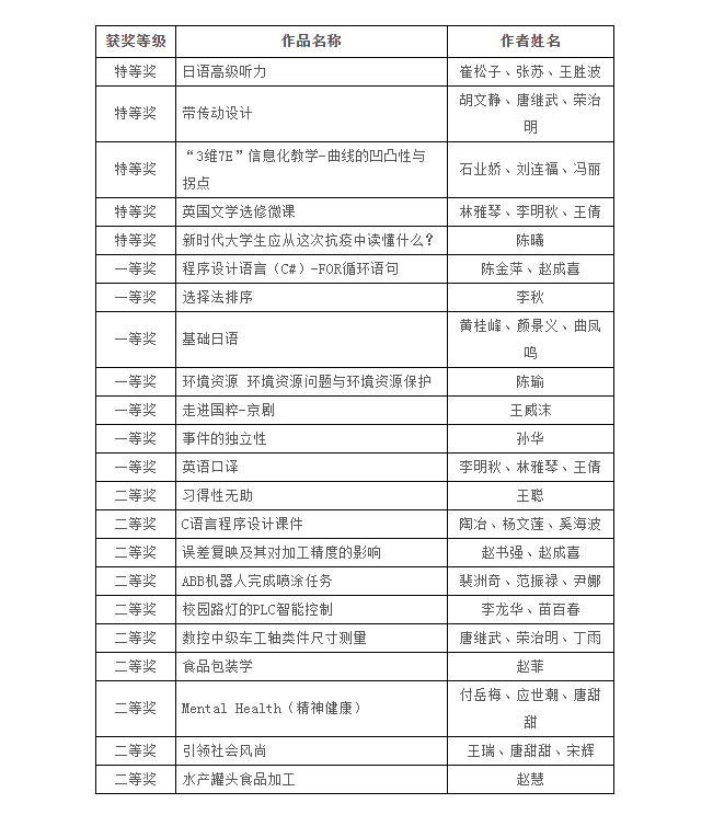 共推荐4部作品。其中,崔松子、张苏、王胜波老师的《日语高级听力》以及林雅琴、李明秋、王倩老师的《英国文学》选修微课获特等奖,黄桂峰、颜景义、曲凤鸣老师的《基础日语》和李明秋、林雅琴、王倩的《英语口译》获一等奖。特等奖作品将由学校推荐参加“第二十五届辽宁省教师教育教学信息化交流活动”,所有获奖作品推荐参加“第二十五届全国教师教育教学信息化交流活动”。