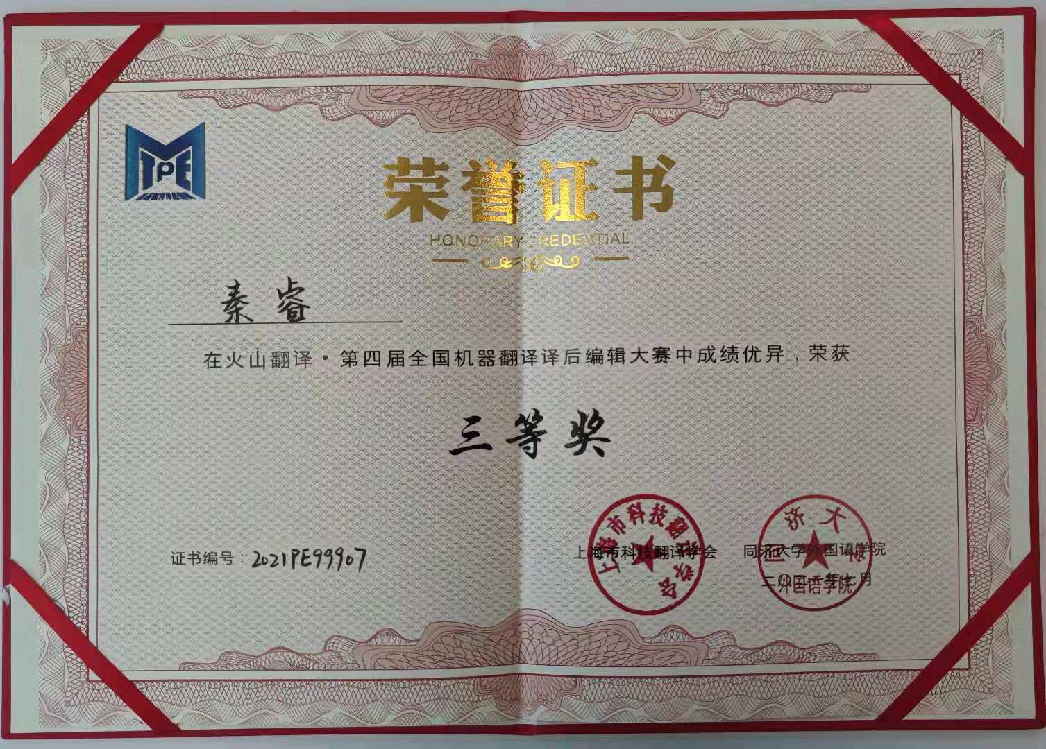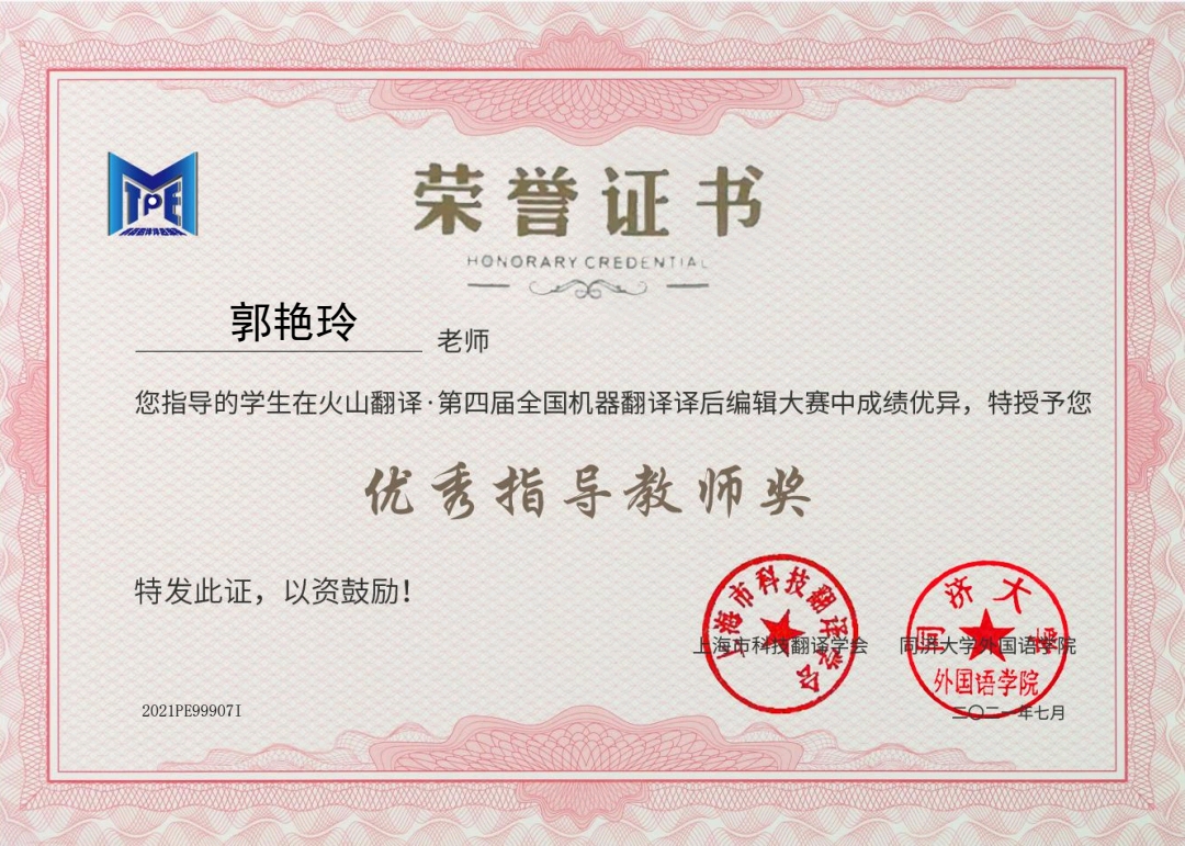 7月24日,“火山翻译·第四届全国机器翻译译后编辑大赛” 比赛成绩公布,麻豆视频 2019级英语笔译研究生秦睿在其导师郭艳玲教授的指导下荣获“火山翻译·第四届全国机器翻译译后编辑大赛”三等奖的好成绩,郭艳玲教授获得“优秀指导教师”荣誉。