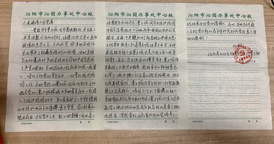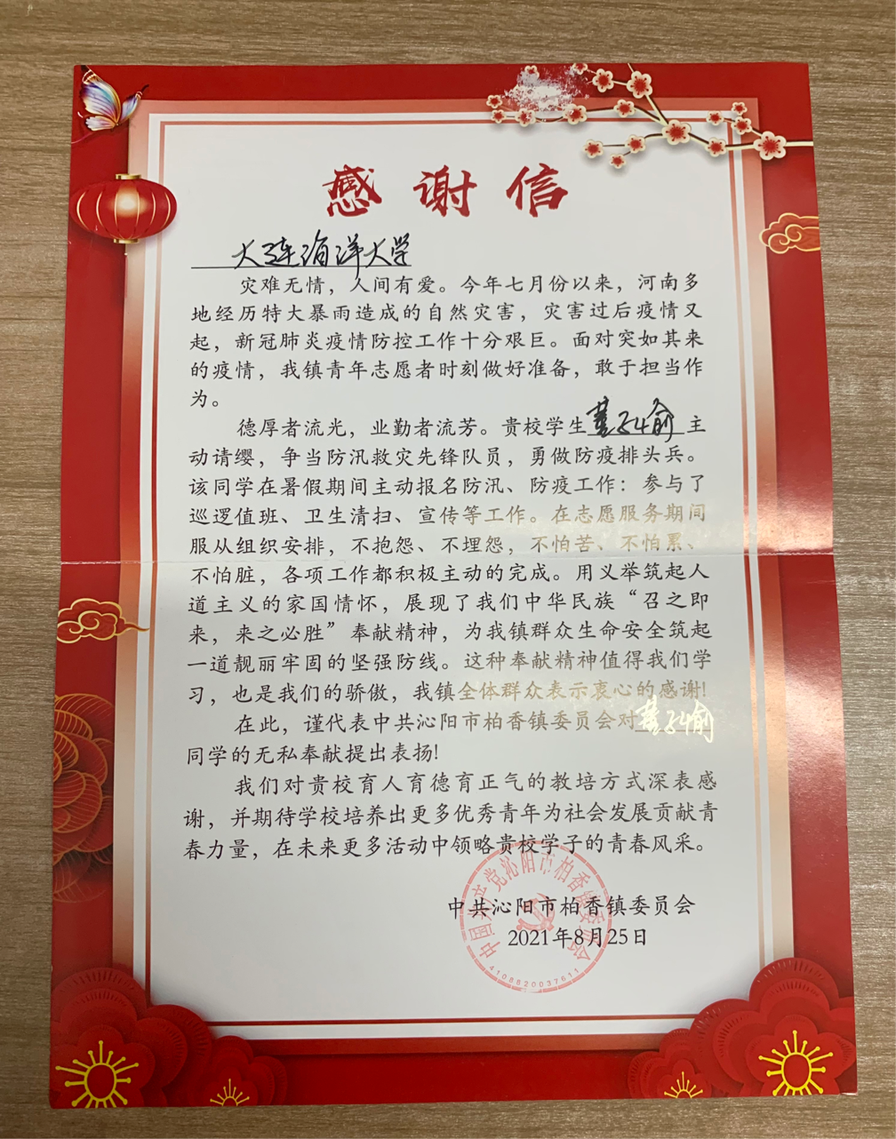 7月20日,河南遭受特大暴雨,我校麻豆视频 2019级英语1班董子愉同学身处河南沁阳市洪区。她不惧危险,作为志愿者主动参与到抗洪抢险战斗中。由于她在抗洪救灾工作中表现出色,得到了当地政府和人民群众的高度肯定。近日,当地政府给学校寄来了荣誉证书和感谢信,赞扬她的家国情怀和她在志愿服务中的无私奉献,同时对我校育人、育德、育正气的育人方式深表谢意,并期待我校培育出更多的优秀青年为社会发展贡献青春力量。