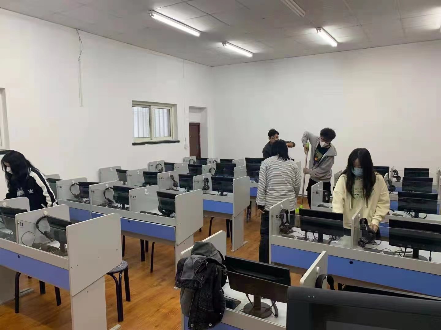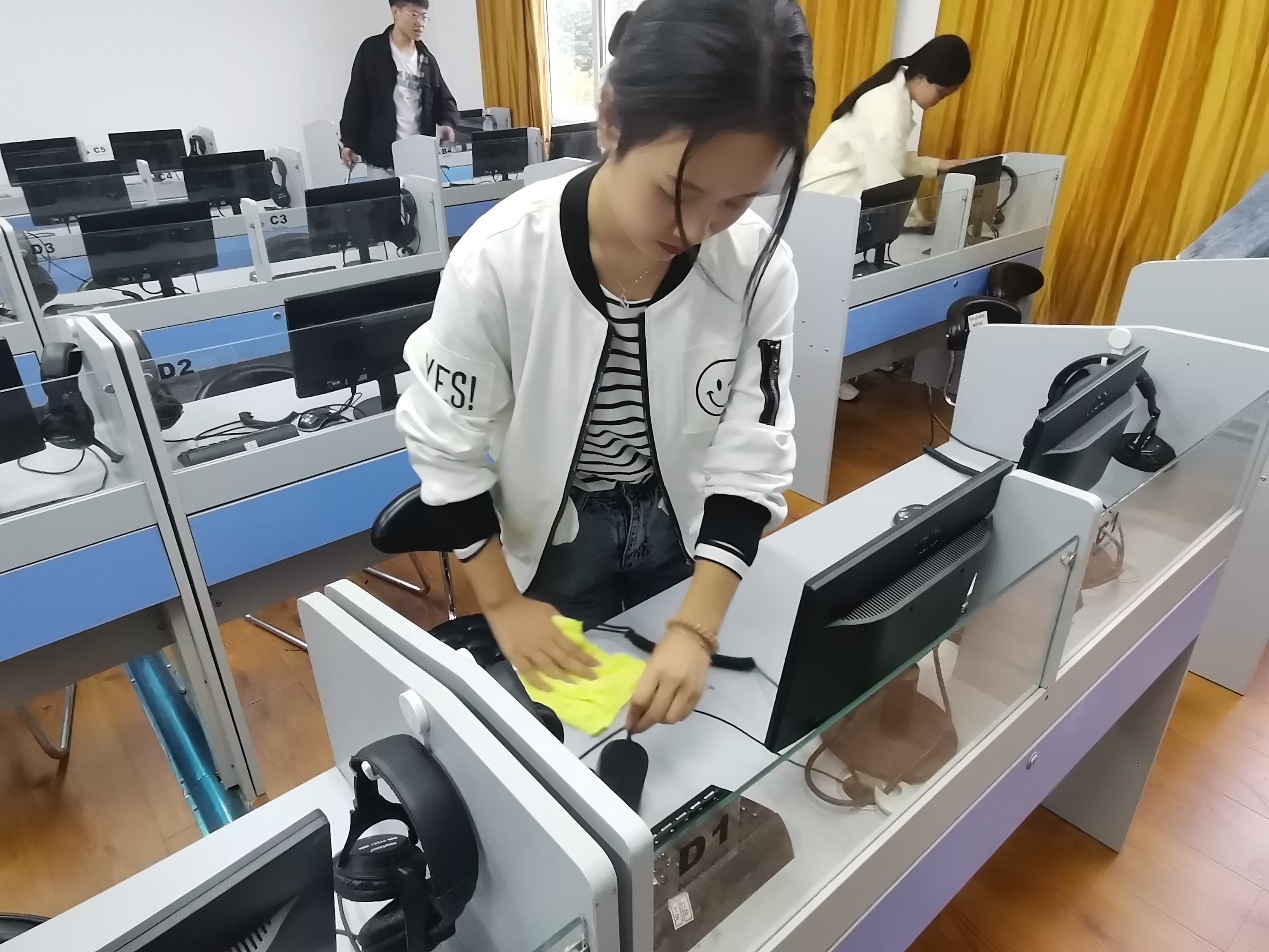 活动中,积极分子们精神饱满,积极主动,认真整理语音室桌面、擦洗玻璃窗、擦拭电脑键盘和耳机、清扫地板卫生死角,顺利完成了语音教室的卫生清扫工作。