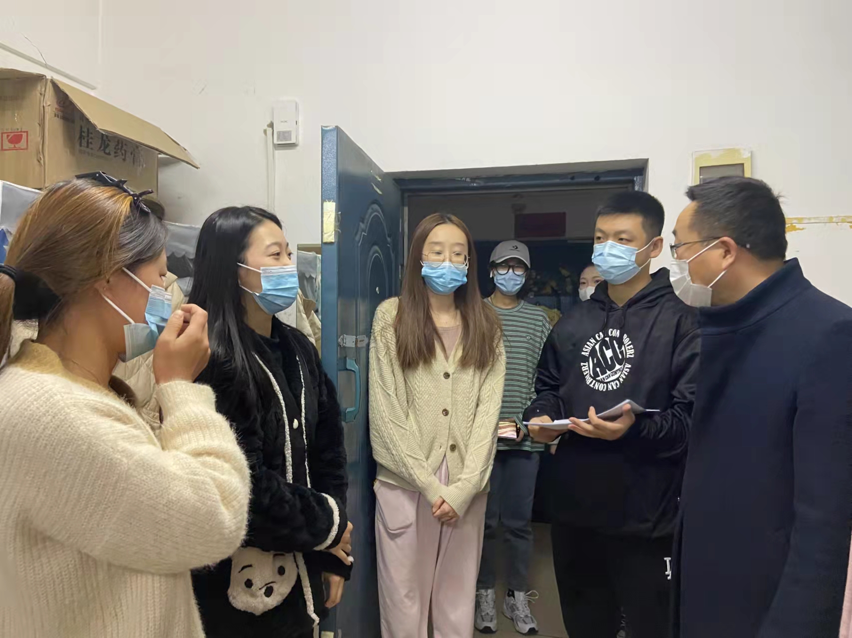 11月27日,第二批进驻大学生公寓的党总支副书记崔永光、教学秘书李祉晔老师再次来到研究生公寓,查看宿舍内疫情防控情况,进行防疫宣传;与学生谈心谈话,及时了解学生思想动态,开展心理排压疏导;认真聆听学生线上学习及线下生活情况反馈,主动帮助解决学习和生活中的困难;发挥研究生学生干部作用,与困难同学开展结对帮扶工作。