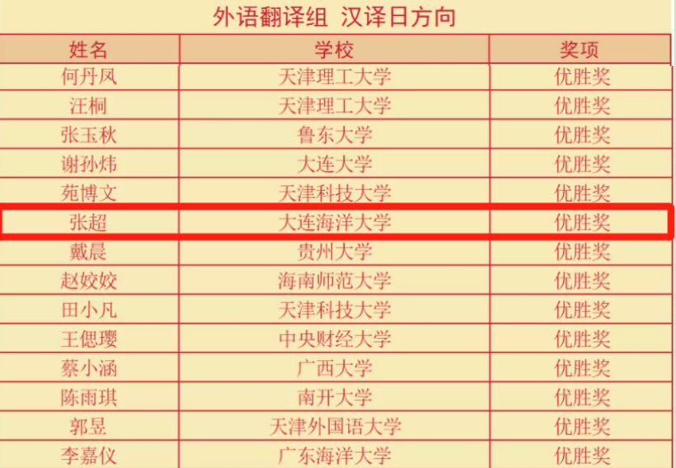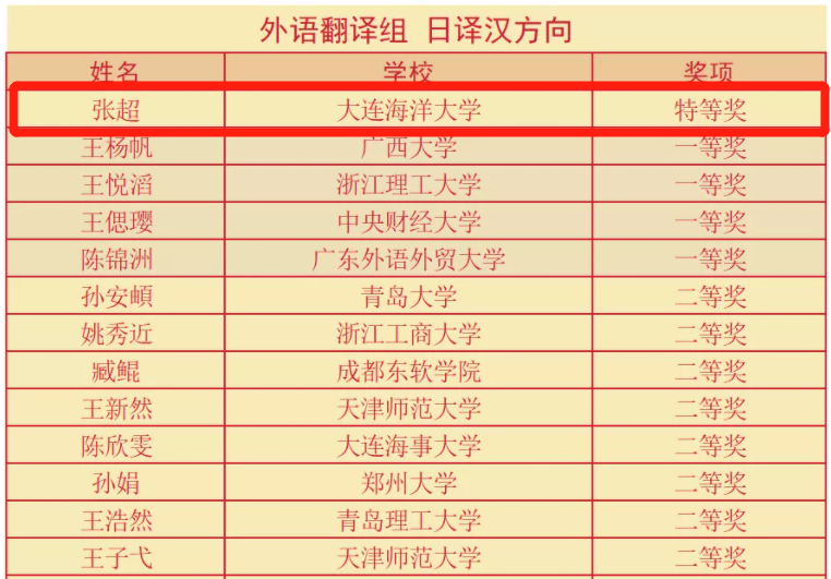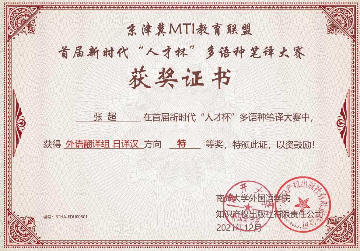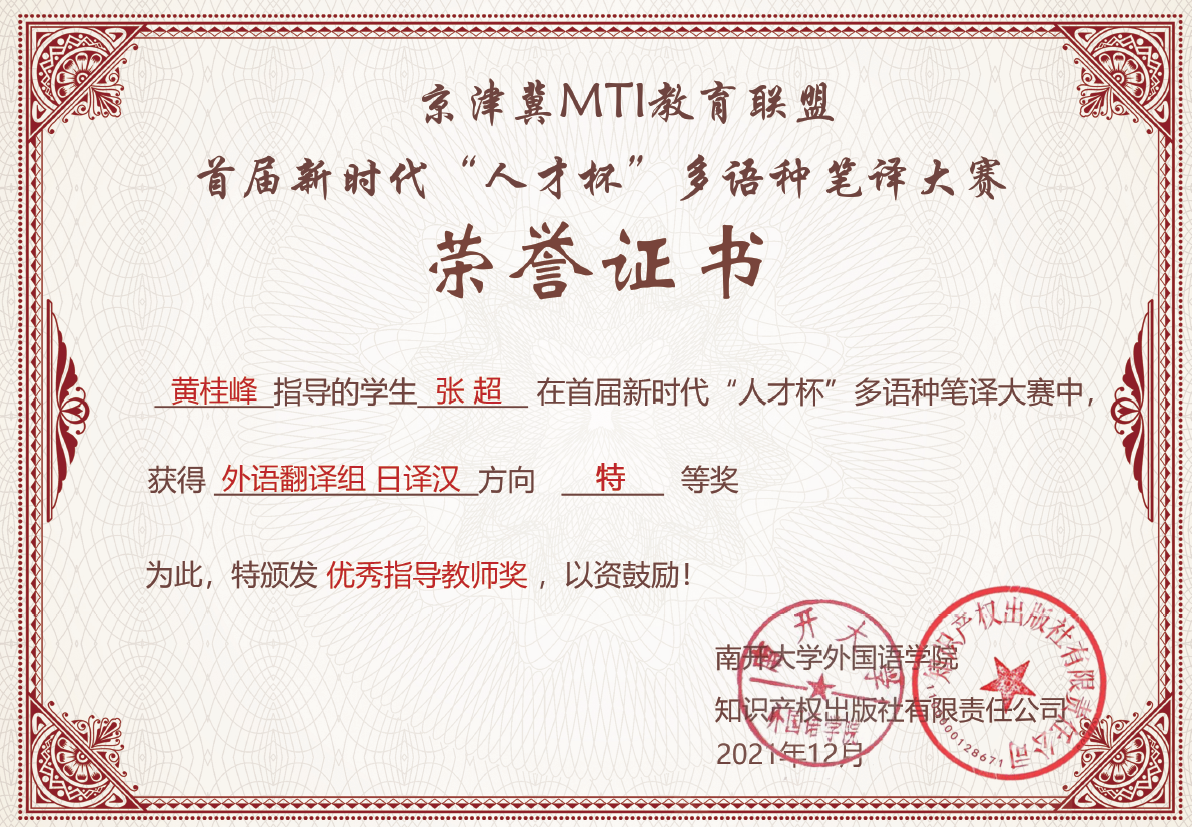 近日,首届新时代“人才杯”多语种翻译大赛结果公布,我校两名2020级日语笔译硕士学生在大赛中取得佳绩。其中,张超获得外语翻译组日译汉方向特等奖(仅1名)和汉译日方向优秀奖,冉井猜获得外语翻译组日译汉方向优秀奖。两位同学分别由日语专业教师黄桂峰和崔松子指导,黄桂峰获得优秀指导教师奖。