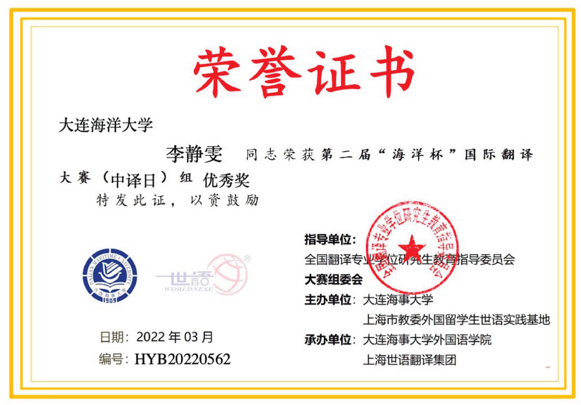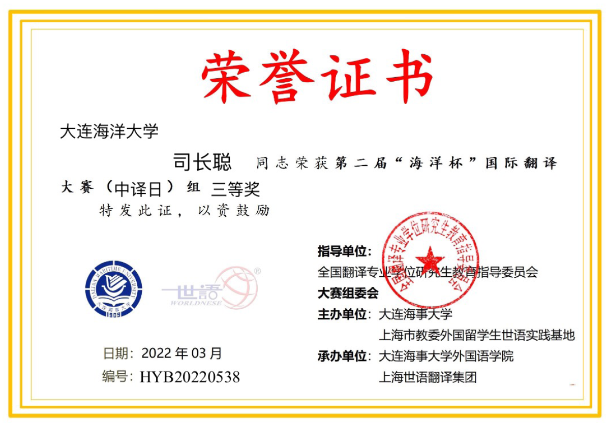 据悉,该项赛事指导单位为全国翻译专业学位研究生教育指导委员会和辽宁省教育类专业学位研究生教育指导委员会,主办单位为大连海事大学和上海市教委外国留学生世语实践基地。大赛旨在推动海洋强国战略和21世纪海上丝绸之路建设,提升海洋强国软实力,让海洋文化中西交融,促进“一带一路”国家海洋文化互学互鉴,构建人类命运共同体。