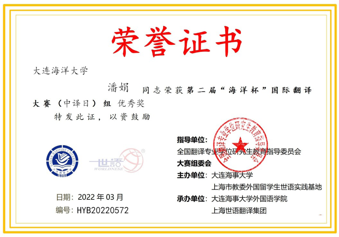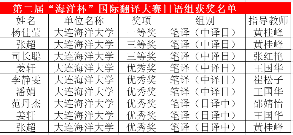 在笔译(中译日)组中,杨佳莹同学脱颖而出,摘取桂冠,获得一等奖(仅1人),张超和司长聪两位同学获三等奖,姜轩、李静雯和潘娟等三位同学获优秀奖;在笔译(日译中)组中,范丹杰、姜轩和张超等三位同学获优秀奖。日语硕士生导师黄桂峰、张红艳、王国华、崔松子、邵婧怡等五位老师全程参与,精心指导,最终黄桂峰、张红艳、王国华老师获得优秀指导教师奖。