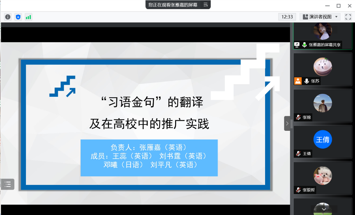 经过评审委员的综合评分,邹宇驰等同学的《云乡助教——乡村公益互联云智教》(指导教师:郭艳玲)被确定推荐国家级项目申报;郭倩如等同学的《Build Your Dream 职业启蒙教育赋能乡村振兴》、杜可可等同学的《<习近平谈治国理政>多语种版本“三进”工作对大学生能力提升与价值塑造效度分析研究》(指导教师:崔永光)被确定推荐省级项目申报,另有10个项目推荐申报校级项目。