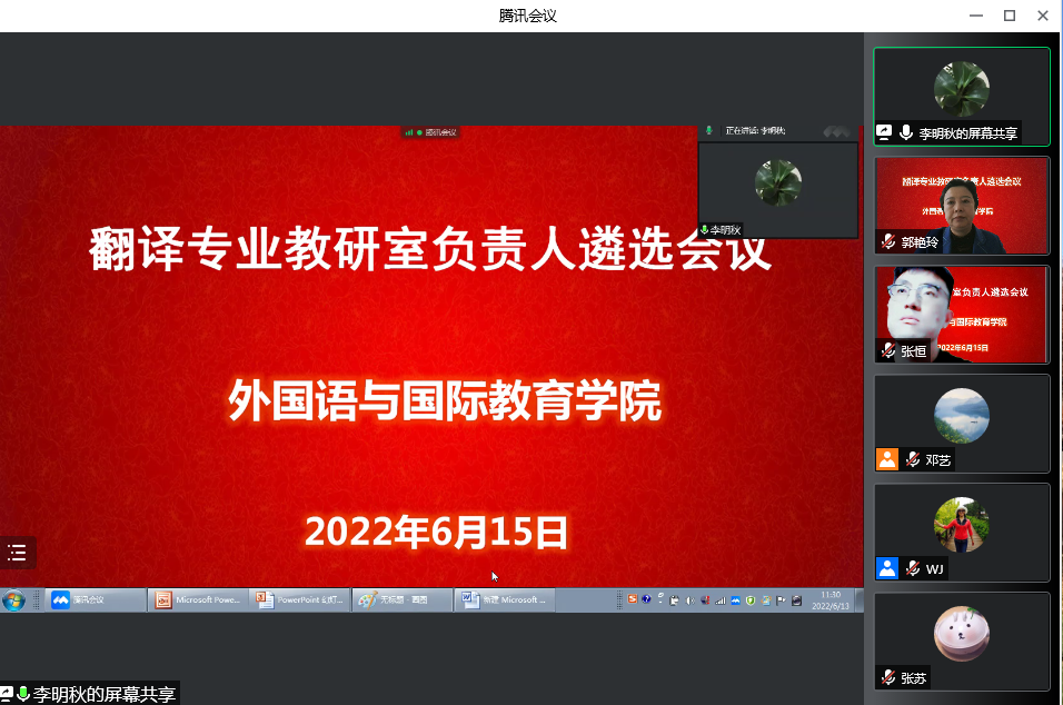 6月15日下午,麻豆视频 以腾讯会议的形式召开了翻译专业负责人遴选会议。学院领导班子成员及翻译专业教研室教师参加了会议。会议由院长郭艳玲主持。