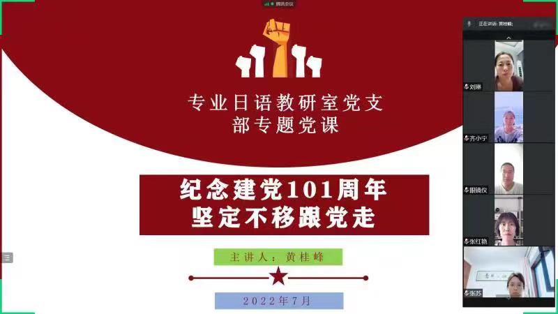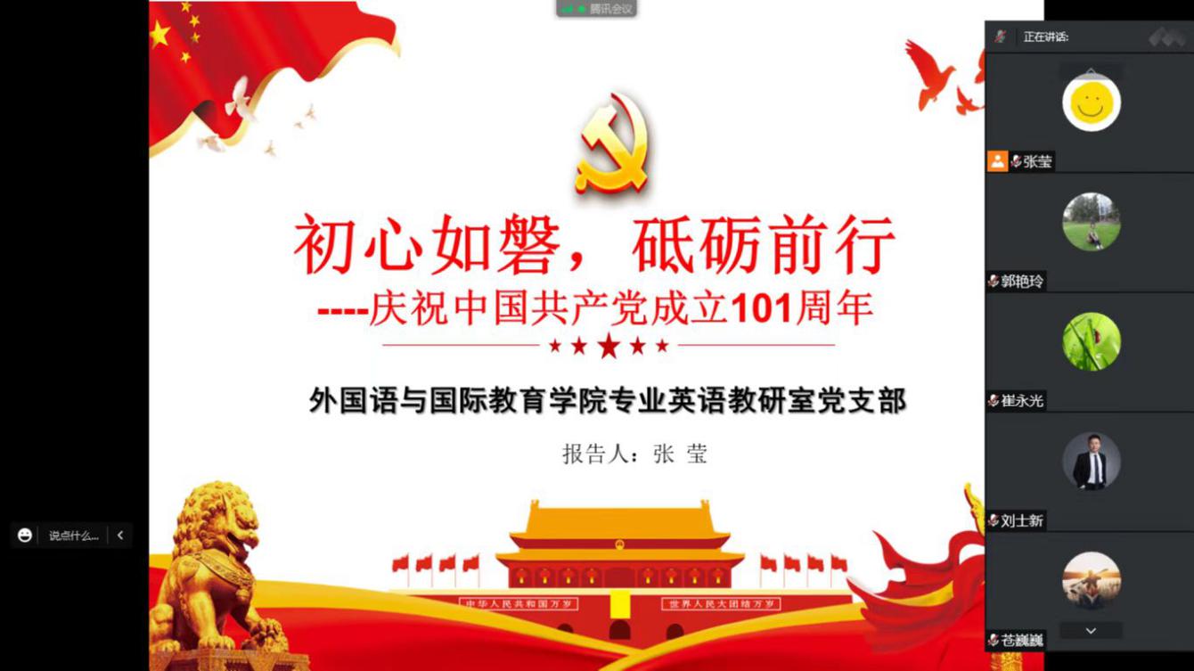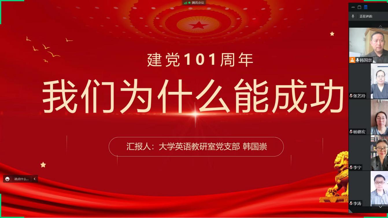 大学英语教研室党支部书记韩国崇、专业英语教研室党支部书记张莹、专业日语教研室党支部书记黄桂峰分别以《建党101周年:我们为什么能成功》、《初心如磐,砥砺前行----庆祝中国共产党成立101周年》、《坚定不移跟党走》为题,向党员们讲述了中国共产党百年奋斗历程、全面从严治党的重要意义、习近平新时代中国特色社会主义思想及“不忘初心、牢记使命”的丰富内涵。