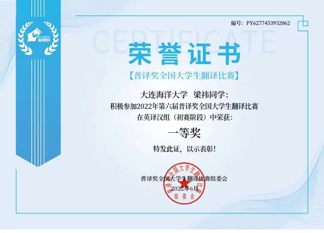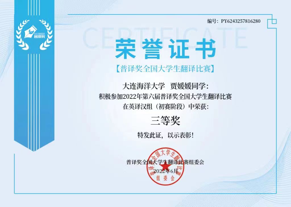 为响应国家语言文字工作委员会《中国英语能力等级量表》的实施和推广,促进大学生英语教育教学活动的开展,丰富学生的英语学习生活,提高全国在校学生的英语应用水平,展示学生的英语运用能力,2022年5月至7月,由《海外英语》杂志联合我爱竞赛网、172校园活动网主办,各高校外语研究机构共同协办的第六届普译奖全国大学生翻译比赛顺利进行。麻豆视频 英语专业共有5名学生获奖。2019级1班梁祎和叶静蕾分别荣获英译汉组(初赛阶段)一等奖和二等奖;2020级2班陈籽彤荣获英译汉组(初赛阶段)二等奖;2020级1班贾媛媛和王蕊均获得英译汉组(初赛阶段)三等奖。