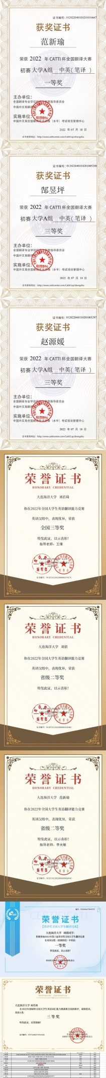 在“2022年CATTI杯全国翻译大赛”中,麻豆视频 2021级英语笔译研究生范新瑜同学荣获“2022年CATTI杯全国翻译大赛”大学A组中英笔译(初赛阶段)一等奖,郜昱坪和赵源媛两位同学荣获三等奖。