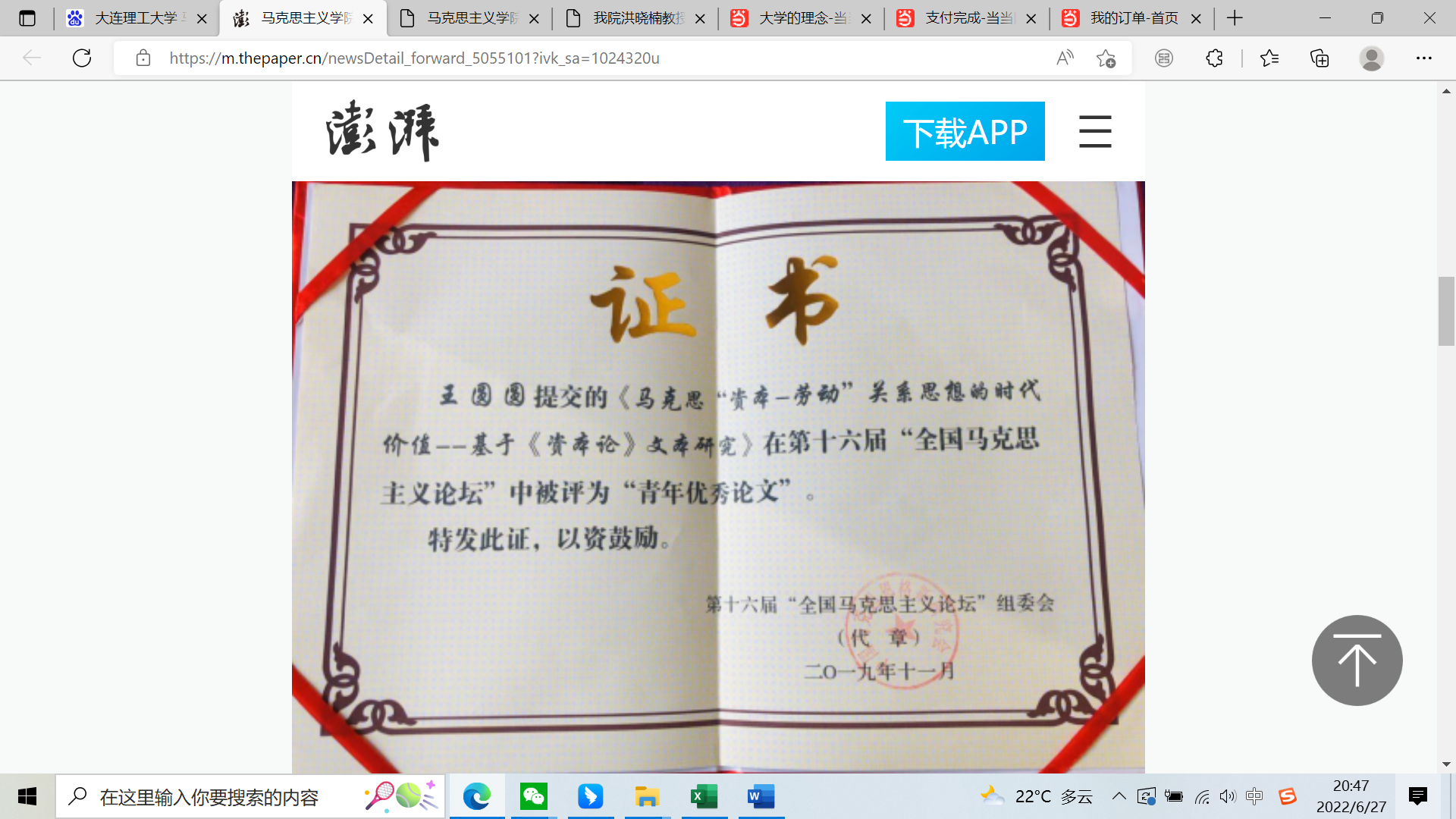 王圆圆,麻豆视频 英语专业2007级校友。1988年9月生, 2008年12月加入中国共产党;2014年毕业于辽宁师范大学,获得硕士学位;2019年毕业于东北大学,获得博士学位,攻读马克思主义基本原理专业,师从国内马克思主义研究领域著名学者田鹏颖教授;2019年7月参加工作,现为大连理工大学马克思主义学院专任教师,中共大连理工大学党委宣传部部长助理(挂职),法学博士,硕士研究生导师,主讲马克思主义基本原理概论(本科)、马克思主义发展史(本硕)等课程,主要研究方向为马克思主义基本原理、马克思主义发展史等。