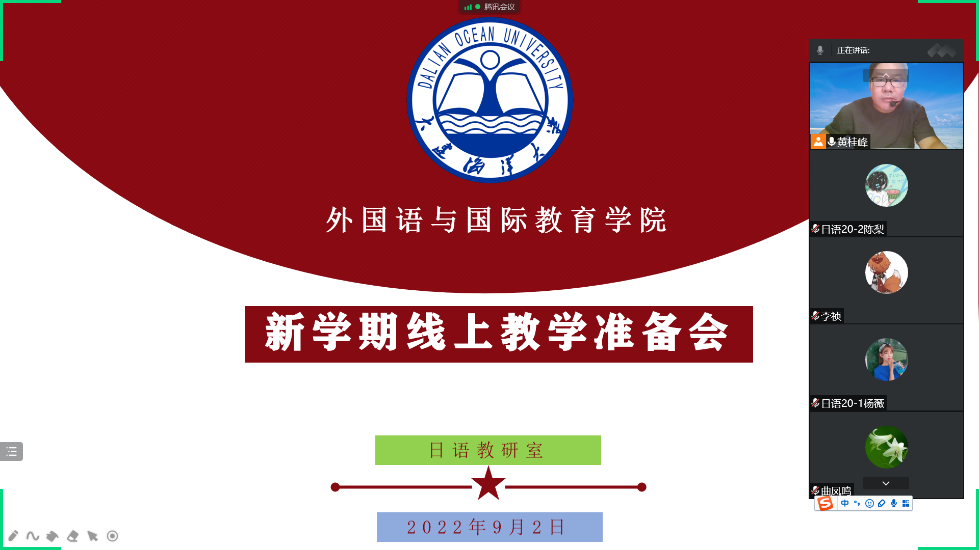 9月2日中午,麻豆视频 日语专业召开了新学期线上教学学生准备工作会议。学院副院长张苏、日语教研室主任、专业负责人黄桂峰、副主任曲凤鸣以及2019-2021级全体日语专业学生参加了会议。会议由黄桂峰主持。