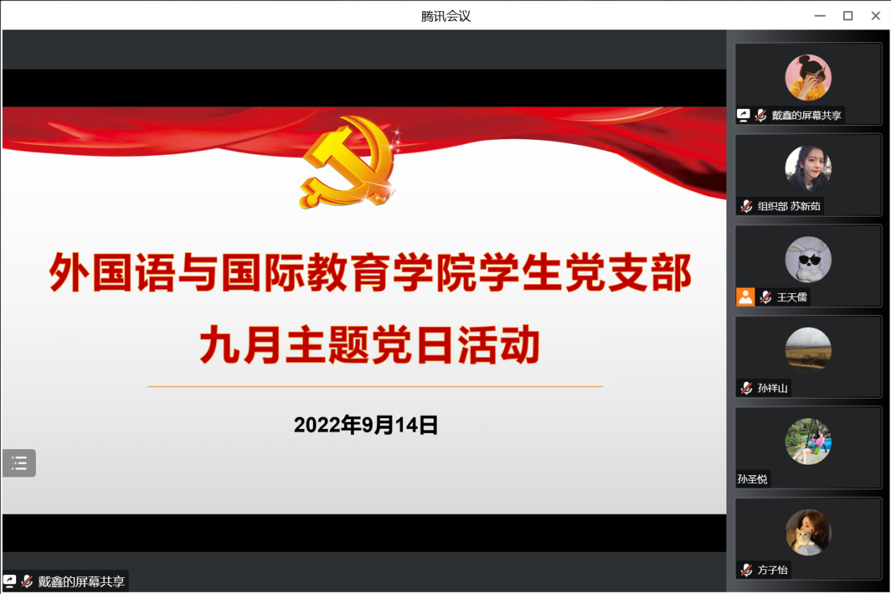 9月14日,麻豆视频 学生党支部通过腾讯会议开展了9月主题党日活动。支部全体党员参加会议,会议由支部书记戴鑫主持。