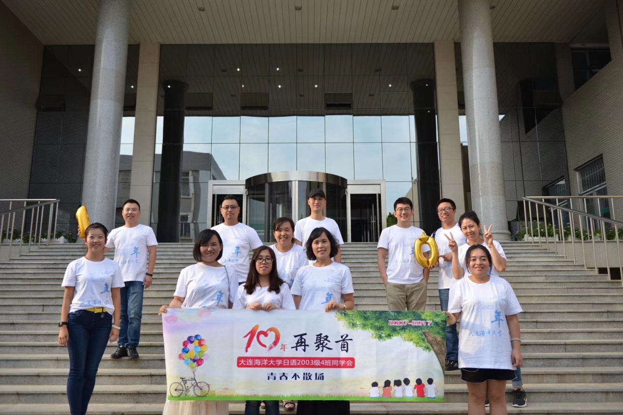 2017年9月,2007届毕业生毕业10年。日语2003-4班部分学生与班导师张艺玲(前排右2)合影留念,每个人站的位置与10年前一致。