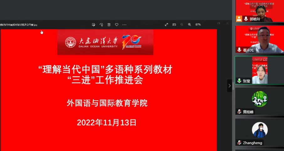 首先,郭艳玲结合大连外国语大学举办的“三进”教学系列教师培训会精神,向全体参会教师传达了新时代背景下推进《习近平谈治国理政》多语种版本和“理解当代中国”系列教材“进高校、进课堂、进头脑”的重要意义、贯彻落实辽宁省普通本科高等学校外国语言文学类专业教学指导委员会关于“三进”工作部署的具体要求,要求全体教师提高站位、强化意识、提出设想。