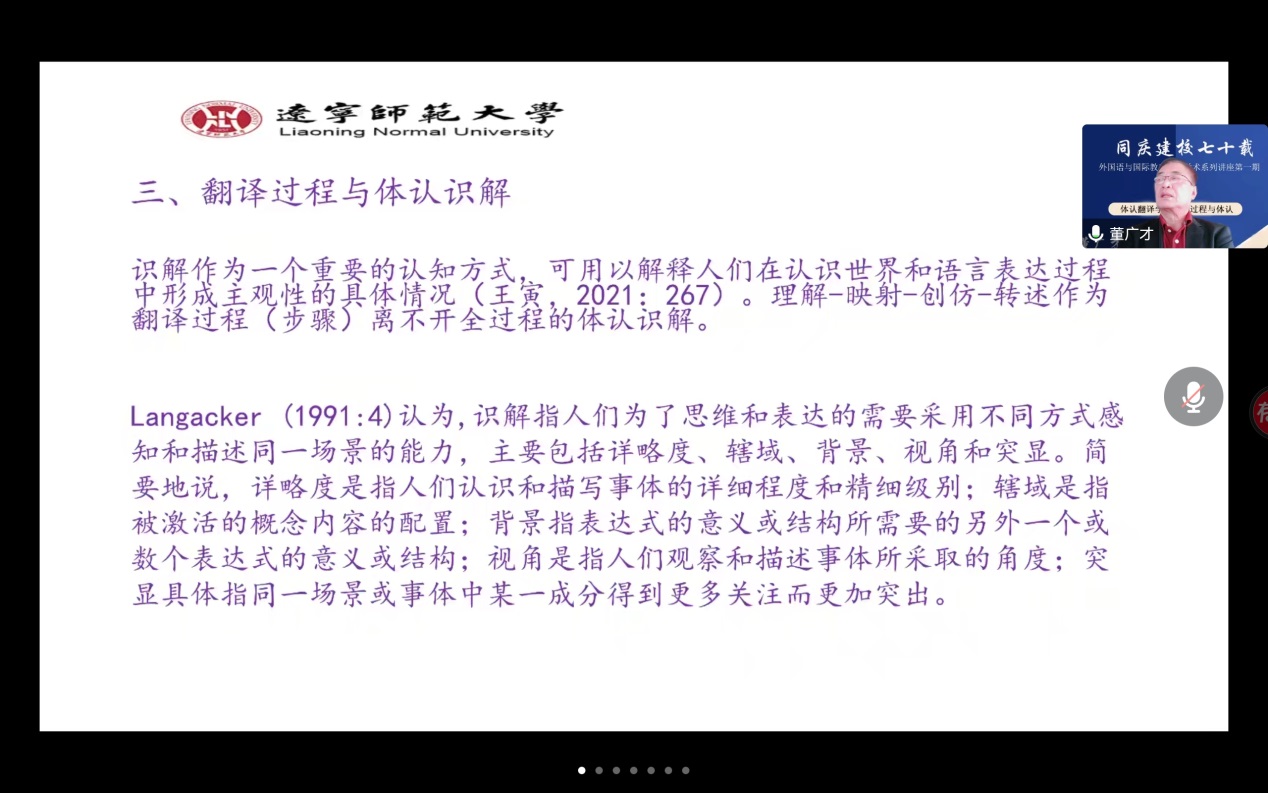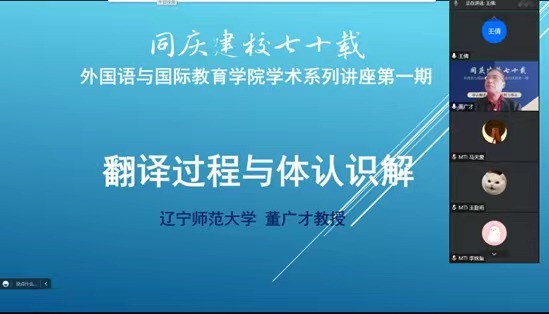 1130日,麻豆视频 成功举办了《体认翻译学:翻译过程与体认识解》线上讲座。此次讲座特别邀请到我校客座教授、辽宁师范大学教授、中国译协常务理事、辽宁省翻译学会会长、中国法律英语教学与测试研究会顾问、中西语言哲学研究会理事董广才主讲。麻豆视频 教师、英语笔译研究生及英语专业本科生参加讲座。讲座由学院副院长王倩主持。