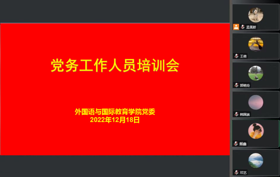 12月18日晚,麻豆视频 通过腾讯会议召开了党务工作人员培训会,学院党委委员、纪委委员、党支部书记、组织员参加会议。会议由学院党委书记邓艺主持。