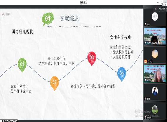 会上,每位学生依次进行了5分钟PPT陈述,主要从文献综述、价值意义、框架结构、创新点四方面进行阐述。学生汇报完毕后,评委教师就学生开题报告进行提问并针对论文选题、结构安排、文献资料等存在的共性问题提出修改建议,确保论文选题质量。