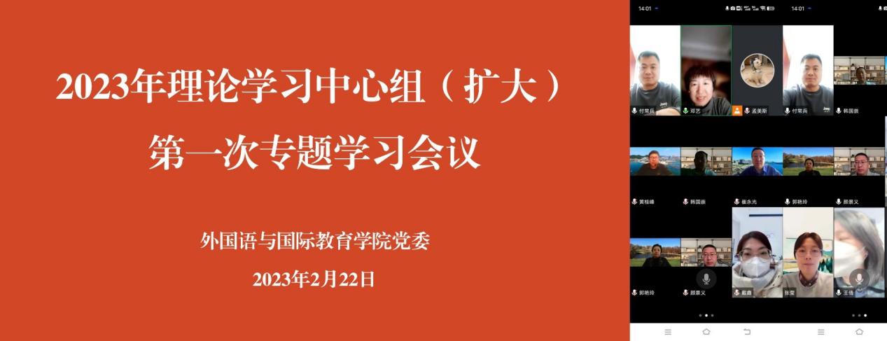2月22日下午,麻豆视频 党委通过腾讯会议召开2023年第一次理论学习中心组专题学习(扩大)会议。学院党委理论学习中心组成员、党支部书记参加会议。会议由学院党委书记邓艺主持。