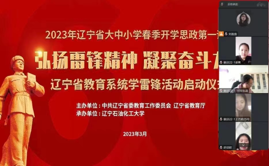 组织全体师生收看了2023年辽宁省大中小学“弘扬雷锋精神 凝聚奋斗力量”春季开学思政第一课暨全省教育系统学雷锋活动启动仪式。