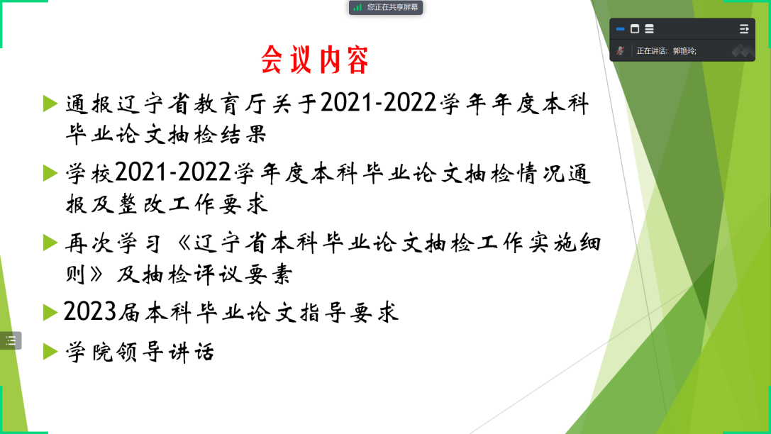 院长郭艳玲在总结发言中强调,要强化毕业论文工作的过程管理,借鉴研究生论文指导经验做法,重点抓住论文开题、中期检查、评阅、学术规范检测、答辩等关键环节,全面落实好指导教师责任制;要加强本科教育内涵建设,多维度梳理本科毕业论文工作存在的突出问题,针对薄弱环节制订整改方案,不断完善毕业论文质量标准,提高毕业论文质量和指导水平。