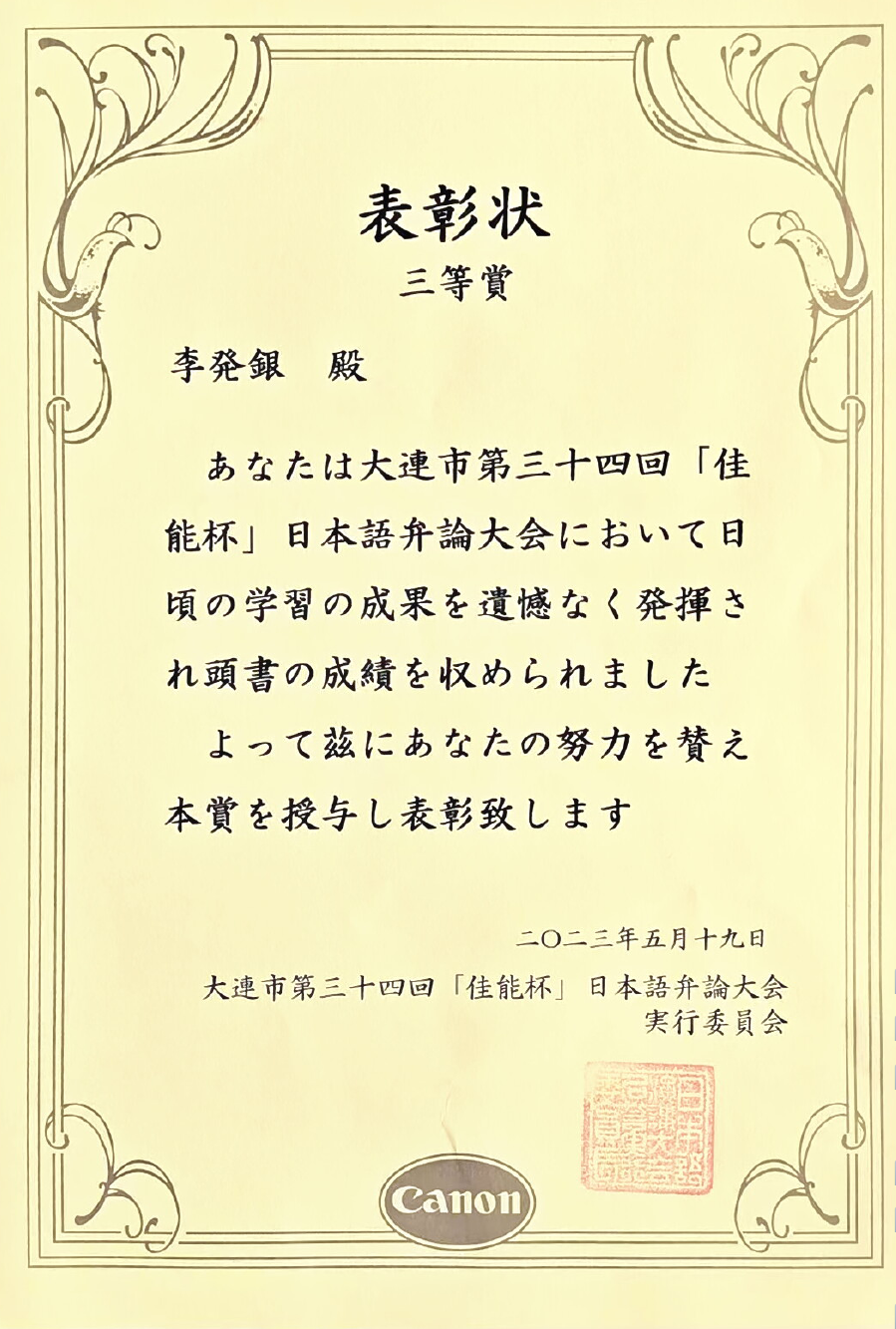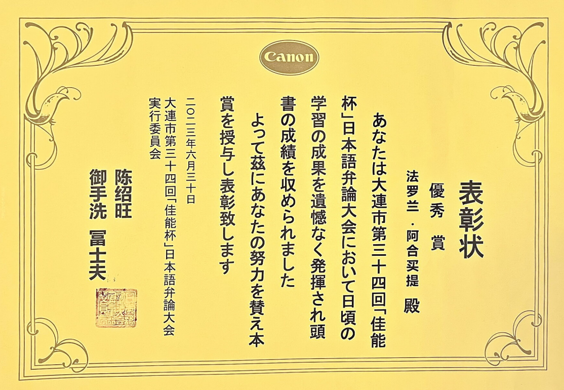 6月30日,由大连市人民对外友好协会、佳能股份有限公司、佳能(中国)有限公司、佳能大连办公设备有限公司联合主办的大连市第34届“佳能杯”日语演讲比赛决赛在大连富丽华大酒店举行。由日语专业教师刘琳指导的我校麻豆视频 英语专业2019级学生法罗兰·阿合买提同学斩获大学非专业组冠军(一等奖);由日语专业教师张红艳指导的麻豆视频 日语专业2021级李发银同学荣获大学专业组三等奖。