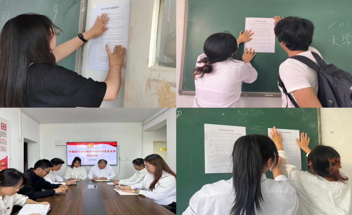会上,戴鑫带领全体党员进行《习近平新时代中国特色社会主义思想专题摘编》第四次专题学习研讨并集体观看了“锤炼党性,勇毅前行”微党课第一期内容,随后,带领支部全体党员和第十七期入党积极分子在渤海校区第一教学楼、第二教学楼各考场张贴了《校内考试考生守则》和《校内考试监考员操作程序》,号召同学们要积极备考,做诚实守信的大学生。